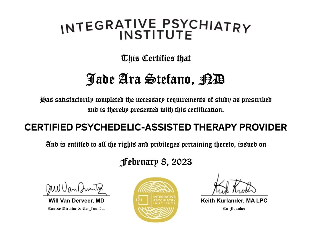 Dr. Jade completed a year-long training program in psychedelic-assisted psychotherapy at the Integrative Psychiatry Insititue in Boulder Colorodo.